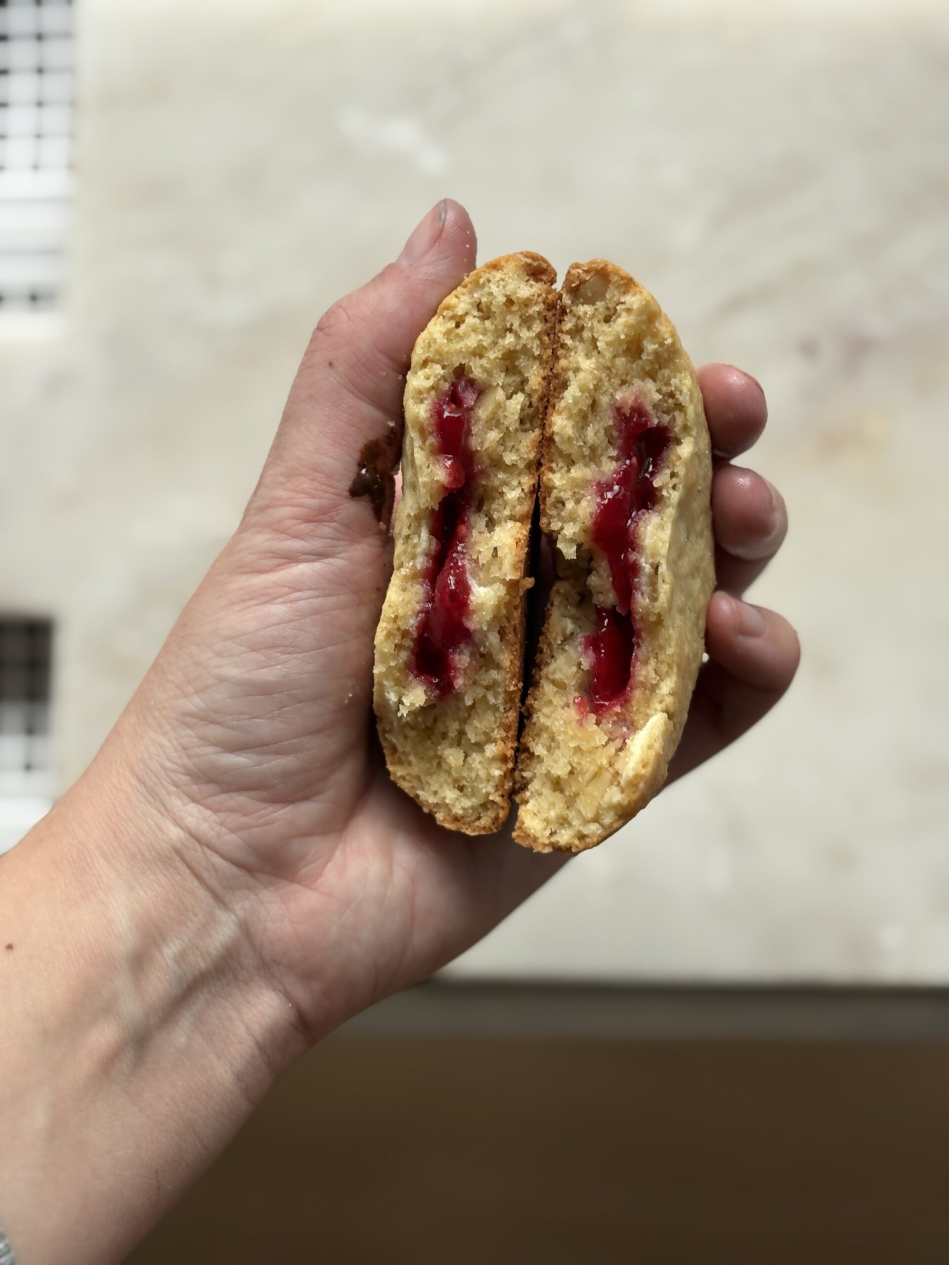 Zutaten: Butter, Zucker, brauner Zucker, Ei, Weizenmehl, haferflocken, Ahornsirup, Kokosöl, Johannisbeer- Himbeer Marmelade(Johannisbeeren, Himbeeren, Gelierzucker, Creme de cassis) , Macadamia, weiße Kuvertüre (Sojalecithin) , Backpulver, Gewürze